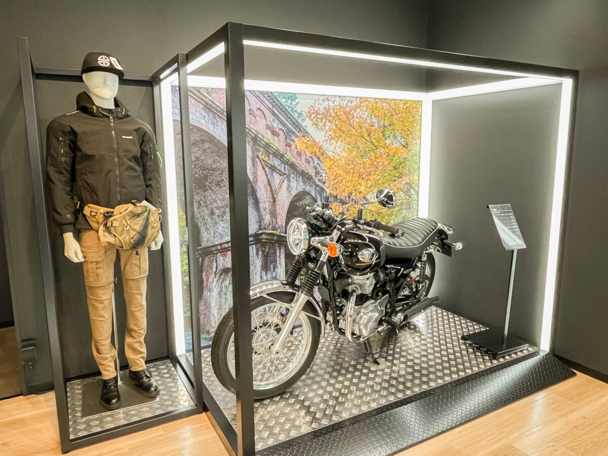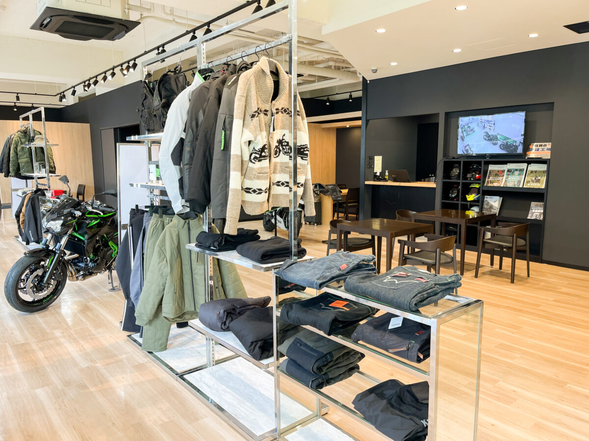 木目調のフロアと白い天井が織りなす明るい店内。モーターサイクルとプラザアパレルがゆったりと展示され、どなたでも楽しめる空間となっています。