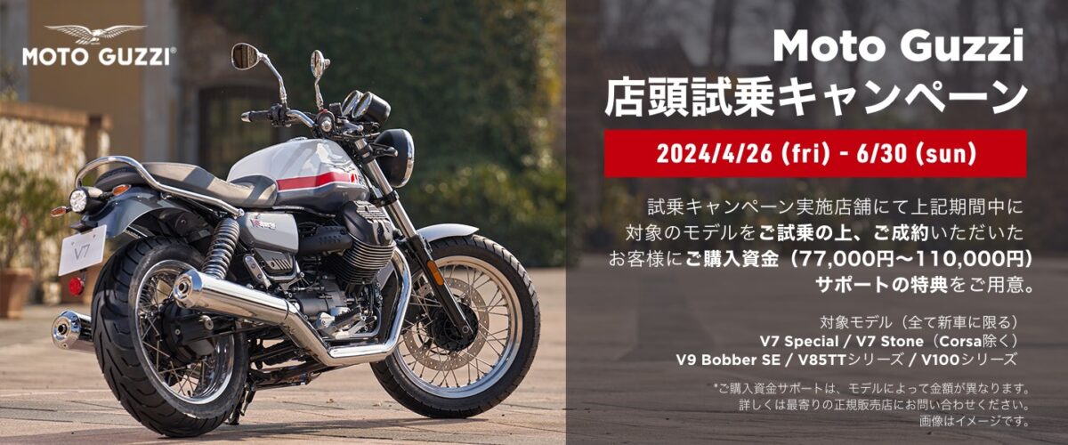 キャンペーン内容 : 期間中にキャンペーン実施販売店にてモト・グッツィをご試乗の方が、期間中に試乗店舗にて対象モデルの新車をご成約された場合、モデルに応じた購入サポート金をプレゼント※2 いたします。