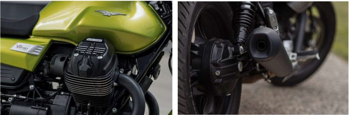 新しい V7 シリーズのエンジンは、Euro 5+ 規制をクリアしつつ、モデル史上最もパワフルで高効率なエンジンで、以前のものと比較し排気量は853cc、ボア84mm×ストローク77mmの数値は変わりませんが、最高出力が65 hp/6,800 rpm から 67.3 hp/6,900 rpm へと 4% 増加しています。さらに特筆すべき点は、最大トルクが 73 Nm/5,000 rpm から 79 Nm /4,400 rpm に増加し、3,500 rpm で発生する最大トルクの 95% が得られることです。これにより、特に低中速回転域を多用する街乗りでのパフォーマンスと快適性が向上し、よりダイナミックなライディングに対しても喜びが高まります。