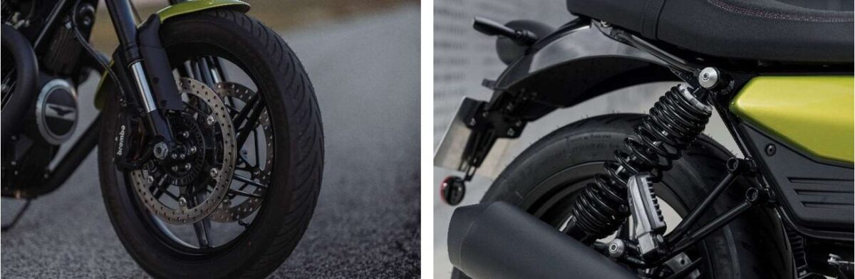 フロントサスペンションについては、V7 Stone と V7 Special は従来の 40 mm径のテレスコピック フォークを維持し、V7 Sport は新たにプリロード調整可能な 41 mm径の倒立フォークを採用し、このモデルがよりスポーティでダイナミックなライディングに焦点を当てて開発していることが表れています。V7 Sport専用の軽量アルミキャストホイールは、V7 Stoneのものよりも 1.8 kgもの軽量化を実現し、ハンドリングの向上に貢献しています。