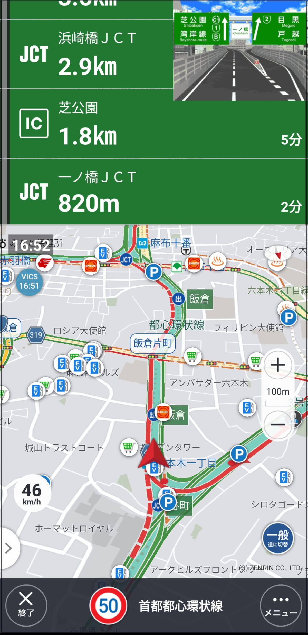 ルート検索や音声ナビゲーション機能を開始しなくても、地図画面を表示しておくだけで、交差点拡大図、レーン、看板情報を地図上で確認できます。地図情報の表示だけでなく、現在走行中の道路に関するさまざまな情報を、音声で発話することもできます。