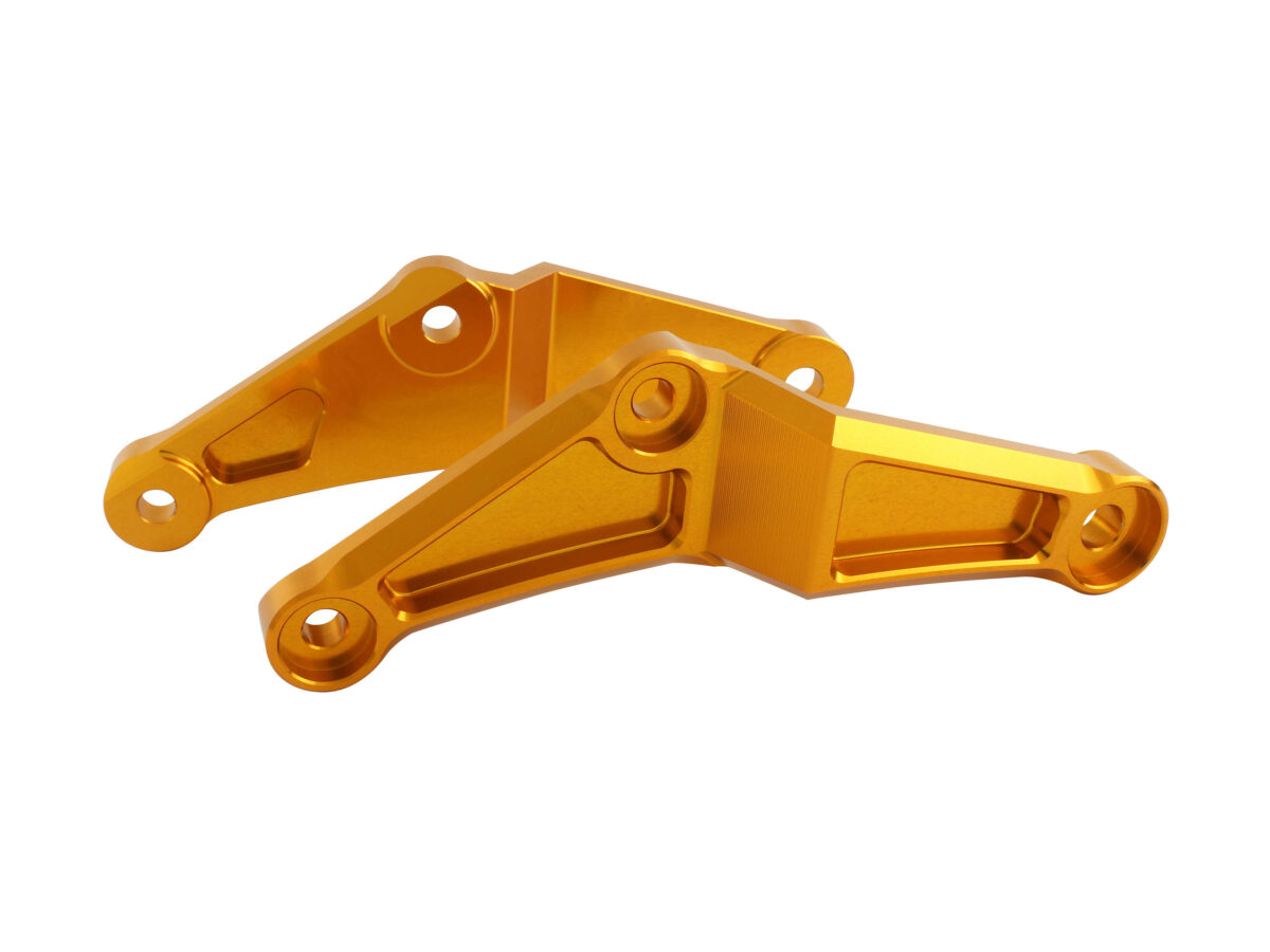 同製品は、高強度のA2017材を削り出し、約12mmの厚みを持たせエンジンとフレームを強固に繋ぐことで走行時のエンジンとフレームの歪み軽減、振動軽減を実現している。また同社のヘッドエンジンハンガーと併用する事でその効果をより期待できるのも特徴だ。カラーはシルバー・ゴールド・ブラックの3色展開でブラックは耐熱処理を施した特殊アルマイトケプラコートブラック仕上げとなる。価格は左右1setで41,800円(税込)。