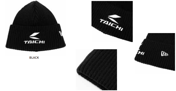 フロントに TAICHI ロゴ、サイドに NEW ERA® のフラッグロゴを刺繍で施した、やや厚手のニットキャップ。