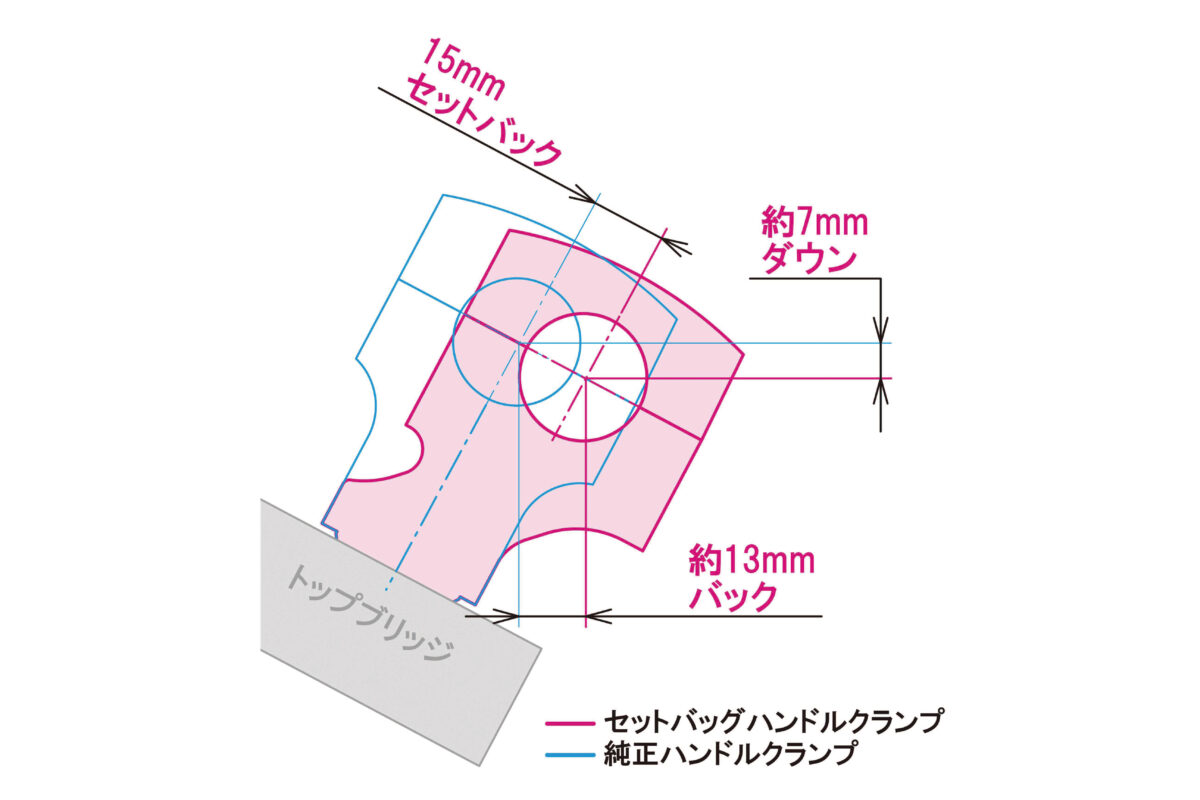 これにより、ハンドル位置を後方に約13mm、下に約7mm下げることができます。