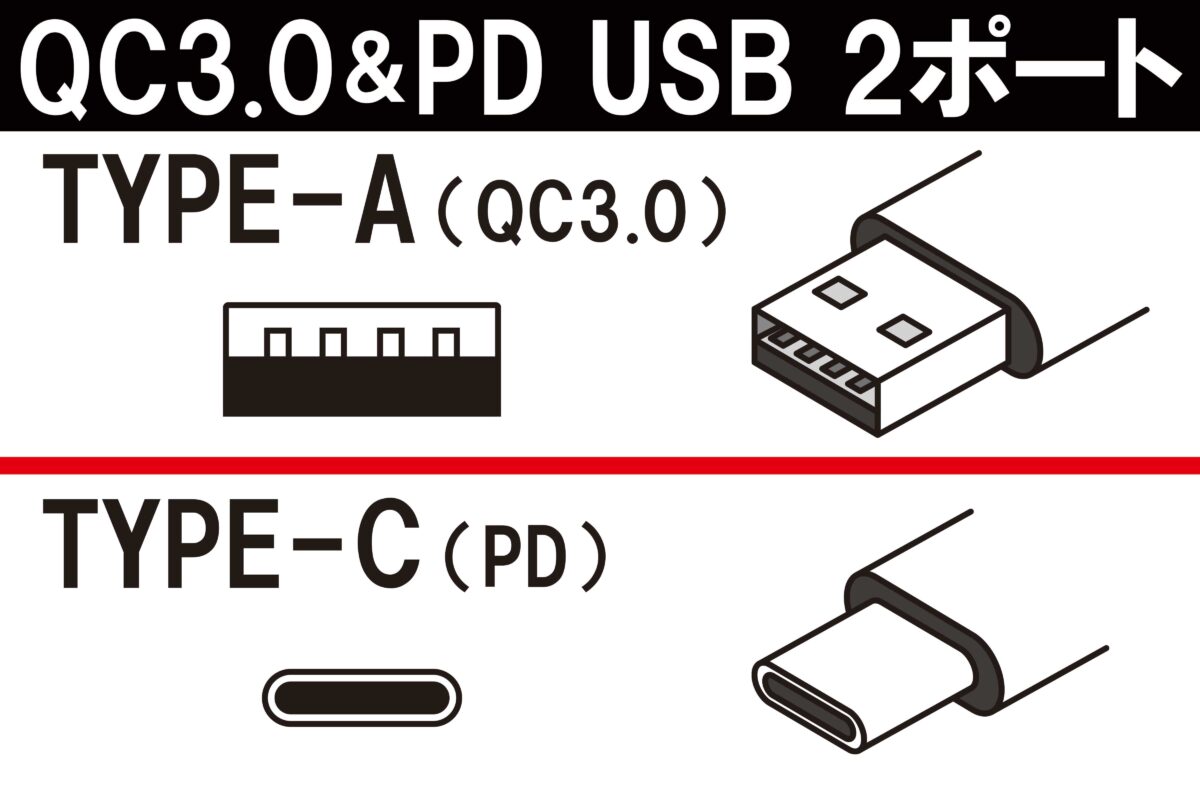 急速充電2ポートを採用 QC3.0 (TYPE-A) & PD (TYPE-C)