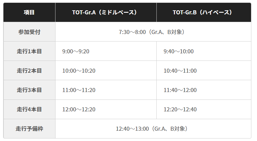 ◉ T.O.T-Gr.A:30 名(筑波コース2000 のラップタイムが1 分4 秒以上の方が対象/ミドルペース)