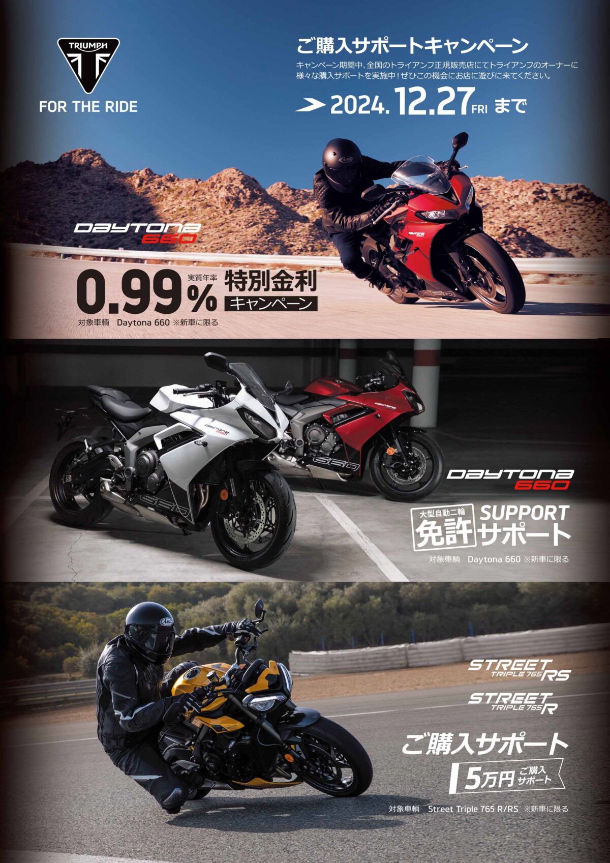 トライアンフモーターサイクルズジャパン株式会社は、2024年10月1日~12月27日までの期間中、全国のトライアンフ正規販売店にて「ご購入サポートキャンペーン」を開催した。