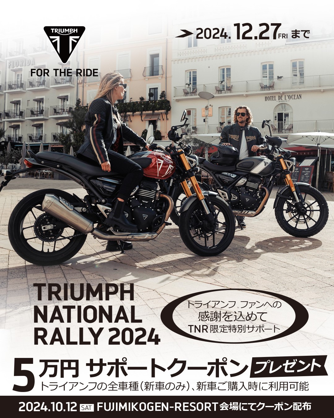 今年の TNR 2024 では 10/12 の当日に、トライアンフ ファンへの感謝を込めて TNR 会場へご来場された方のみを対象とした TNR 特別限定「5 万円サポートクーポン」の配布を決定しました。
