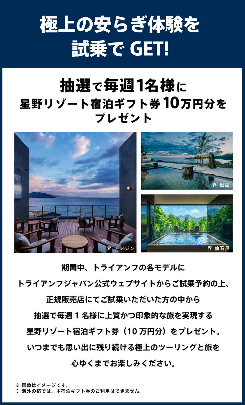 トライアンフ公式WEBサイトから試乗お申し込みの上、全国のトライアンフ正規販売店でご試乗された方を対象に、毎週抽選で1名様に星野リゾート宿泊券ギフト券10万円をプレゼントいたします。