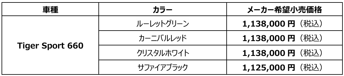 車両本体価格は¥1,125,000からと、新型Tiger Sport 660は非常にお買い得なモデルとなっています。
