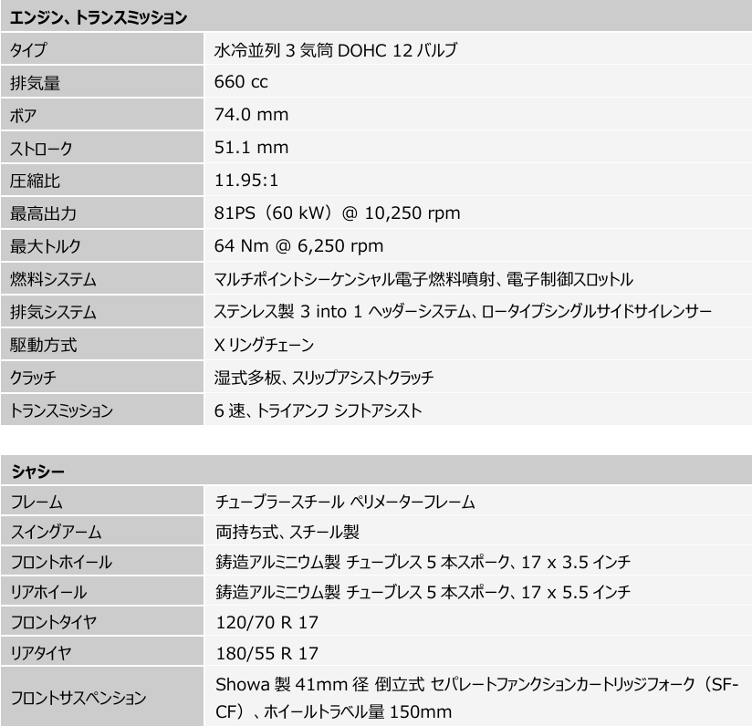 同モデルは、全回転域でピークトルクの90%以上を発揮するパワフルな三気筒エンジンを搭載し、新たにライディングモードに「スポーツ」を追加、さらにターンバイターンナビゲーション対応のBluetooth接続機能に、クルーズコントロール、トライアンフ シフトアシストなど数々の先進テクノロジーを標準装備している。カラーリングはぜん4色展開で、2025年2月より正規販売店にて販売開始予定となっている。