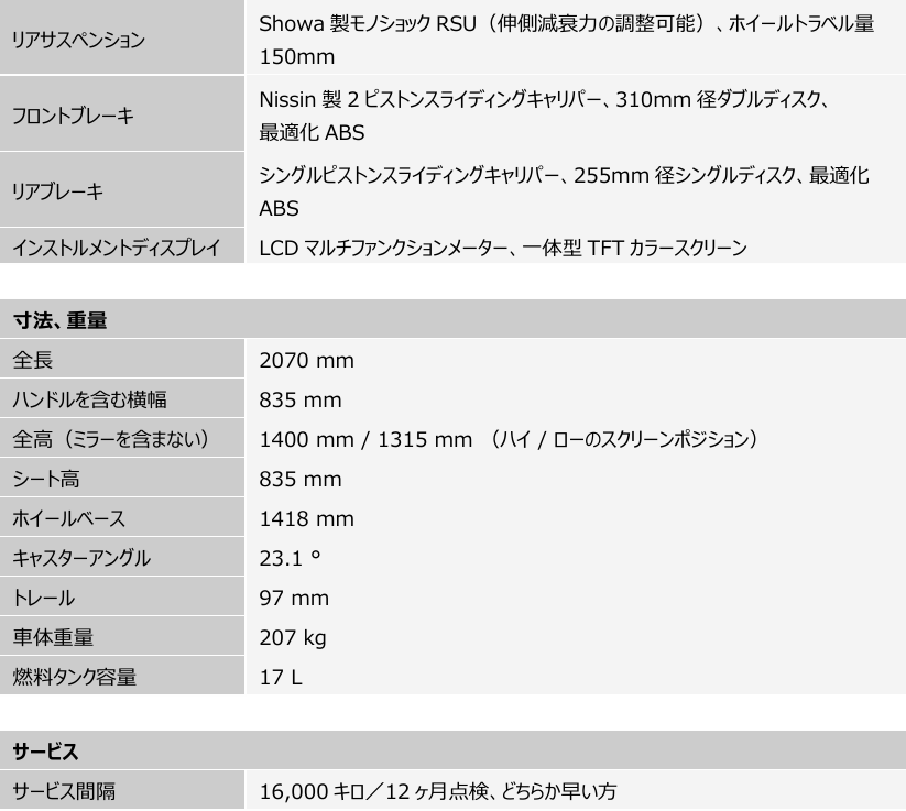 一日中快適に走行できるよう設計されたShowa製41mm倒立式カートリッジフォークと、リモート式プリロード調整機能付きモノショックリアサスペンションが、ソロでもタンデム走行でも安定性を確保し、17リットルの燃料タンクは長距離のツーリングにも十分な航続距離を提供します。