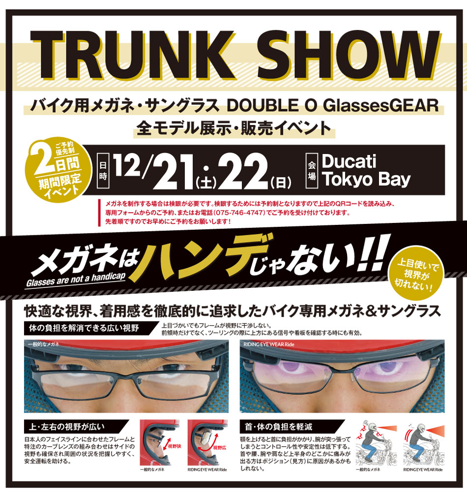 この度、バイク専用メガネの体験ができるイベント、「TRUNK SHOW」が下記にて開催される事となった。