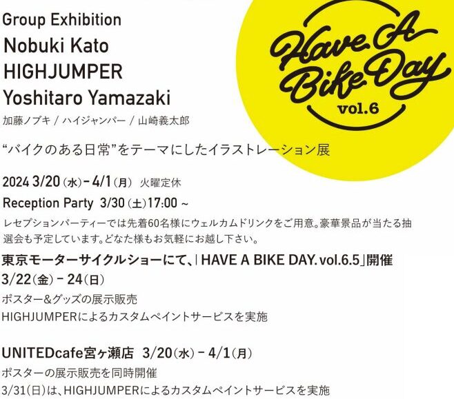 同イベントでは、UNITEDcafe世田谷店にて「HAVE A BIKE DAY.Vol.6」が、UNITEDcafe宮ヶ瀬店にて「HAVE A BIKE DAY ポスター展」が同時開催される予定だ。出演アーティストは加藤ノブキ氏、HIGHJUMPER氏、山崎義太郎氏の3名となる。この機会にツーリングの目的地として立ち寄ってみてはいかがだろうか。