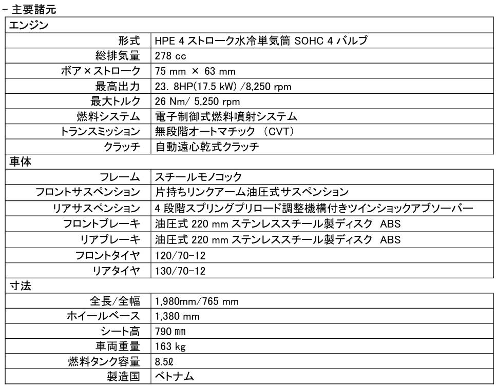 同モデルは、フロントフェンダー上に取付けられた 「ファロバッソ(ローヘッドランプ)」を採用し、むき出しの金属製パイプハンドルバーなど、ベスパの象徴的なスタイルを復活させたことで、ベスパシリーズの中で最も純粋なクラシックを代表するモデルとなる。また、ベスパ史上最強の23hpを超える300hpeエンジンを搭載し、走る楽しさを味わえるのが特徴だ。