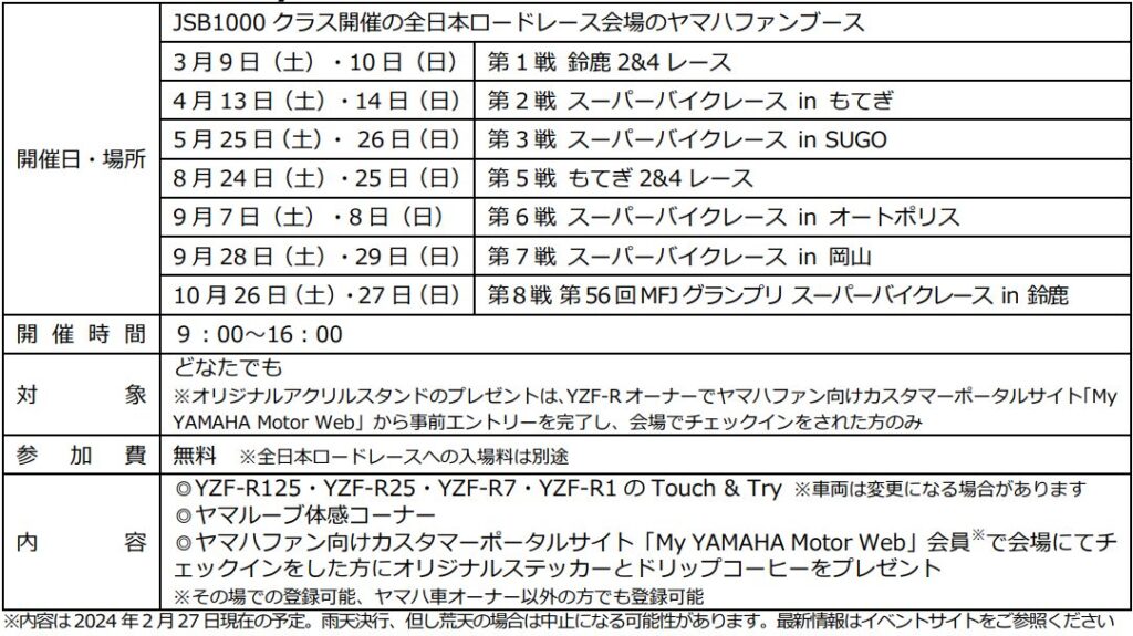 ヤマハ発動機販売株式会社は、「My Yamaha Motor café×YZF-R」を JSB1000 クラスが行われる全日本ロードレース選手権7会場のヤマハファンブースにて開催すると発表した。
