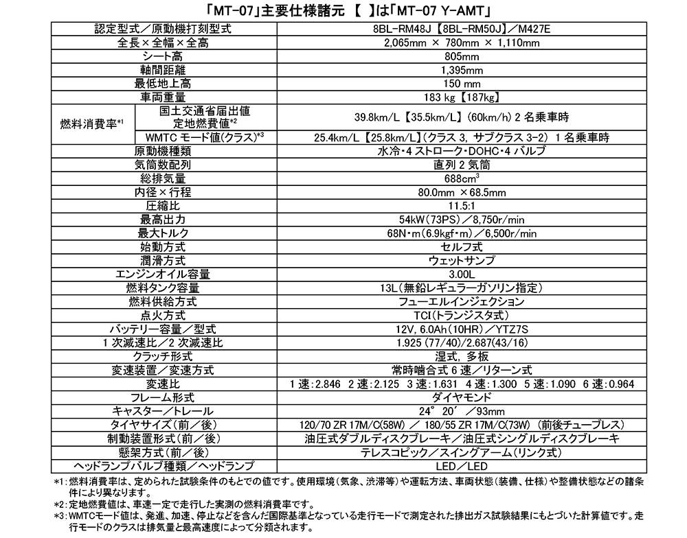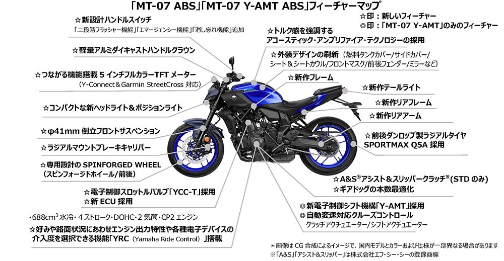 同モデルは、トルクフルなエンジンに扱いやすいボディ、そしてコストパフォーマンスの高さなど従来からの特徴に加えて、「YCC-T」(電子制御スロットル)の初採用や剛性バランスを最適化した新設計フレーム&リアアームの搭載などにより、質感、先進性、軽快感の充実を図っている。また、クラッチレバーやシフトペダル操作が不要の自動変速トランスミッション「Y-AMT」を備えた「MT-07 Y-AMT ABS」もバリエーションとして設定している。