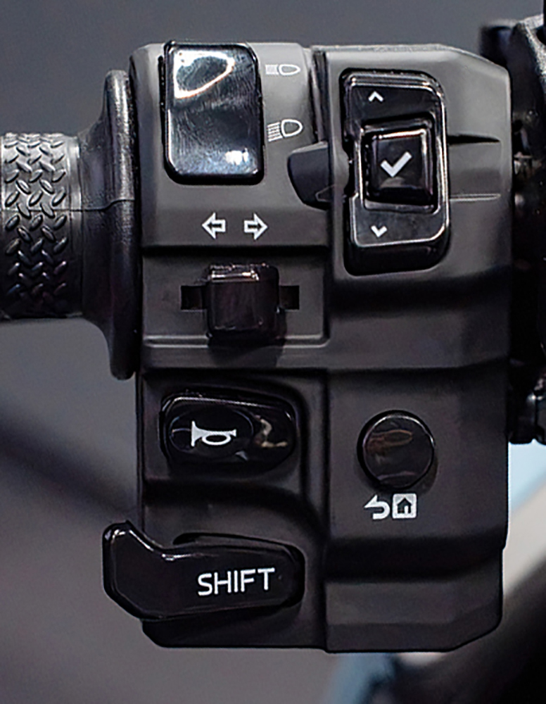モード選択は左ハンドルのスイッチボックス人差指側に装備しているボタン操作で行います。また選択したモードは、ディスプレイに「T」または「S」で表示されます。メインキーをONにしたときの走行モードは、前回走行時の走行モードが維持されます。