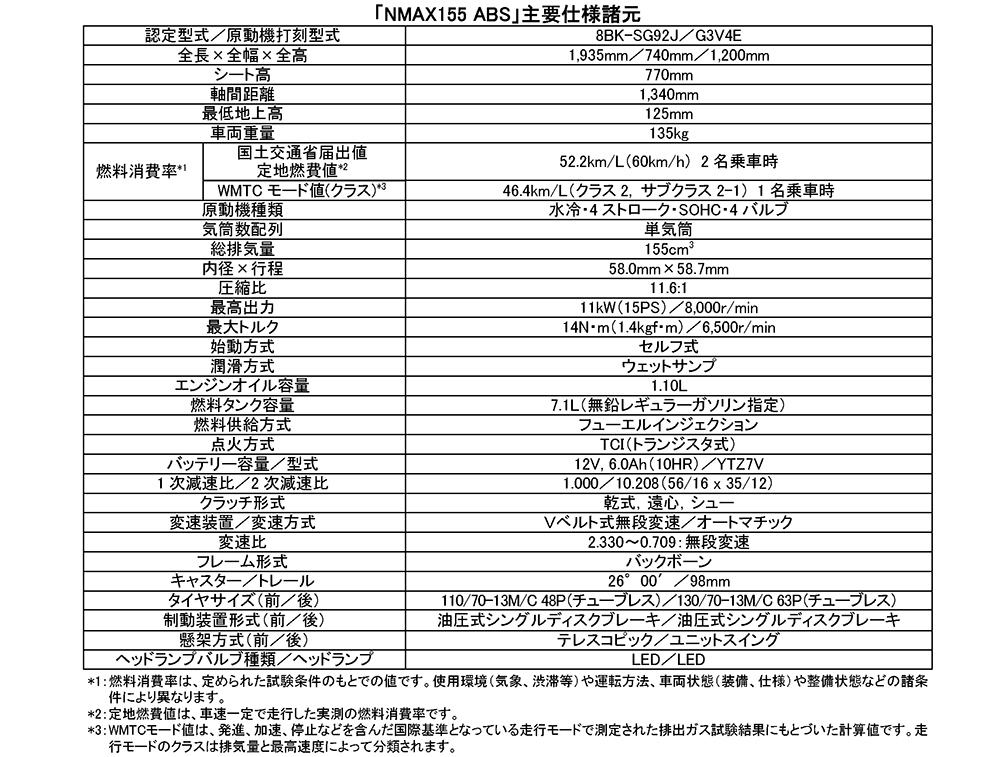 ※ BLUE CORE(ブルーコア):ヤマハ発動機株式会社は、“走りの楽しさ”と“燃費・環境性能”の両立を高次元で具現化するエンジン設計思想として、2014年より“BLUE CORE” を掲げています。この思想は高効率燃焼、高い冷却性、ロス低減の3点にフォーカスして性能実現を図るもので、「NMAX155 ABS」のエンジンもこの“BLUE CORE”思想に基づき開発しました。商標登録第5676267号。