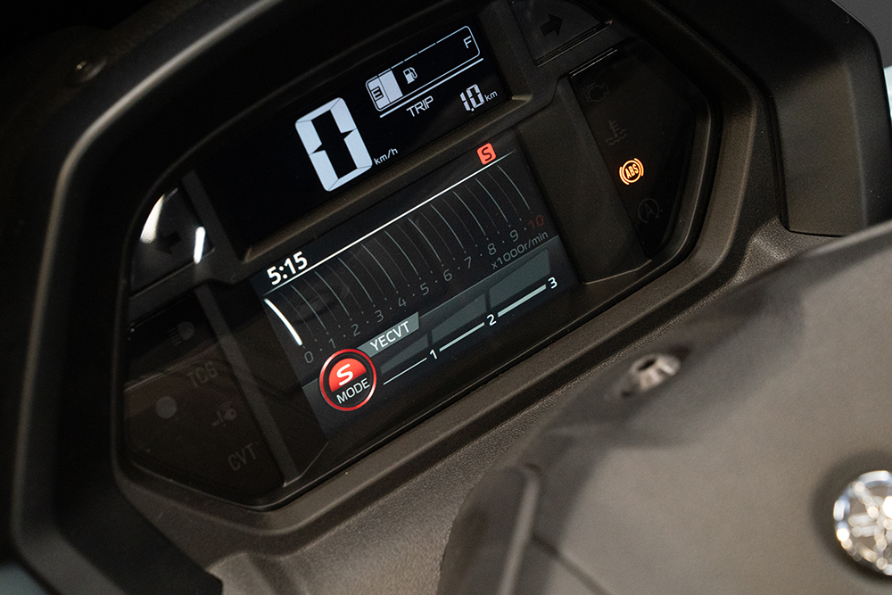 TFTディスプレイ上では、「YECVT」機能を視覚的に強調。走行モード切替のアイコン(左下)は、ライダーが走行時でもすぐにモードを認識できるよう、色の区別がつきやすい2色(青・赤)を用意。またシフトダウン機能にも同様の配色を施すとともに、シフトダウンの介入度もメモリでわかりやすく表示しています。