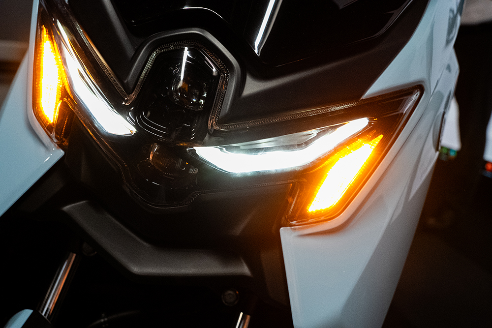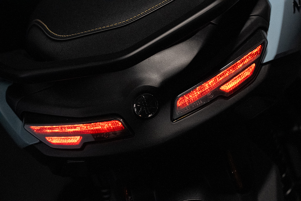 既存のLEDヘッドランプ、LEDポジションランプに合わせ、今回フラッシャーにもLEDを採用。前後フェイスは、コンパクトにまとめつつも、それらの存在感を最大限に際立たせるデザインとしました。MAXシリーズの各モデル名のアルファベットを象ったフェイスにならって、フロントには「NMAX」の“N”と、鏡文字にした”N”が合わさったモチーフを配置。テールランプは斜め上から見ると「M」に見えるようにし、合わせて「NMAX」を表現しています。