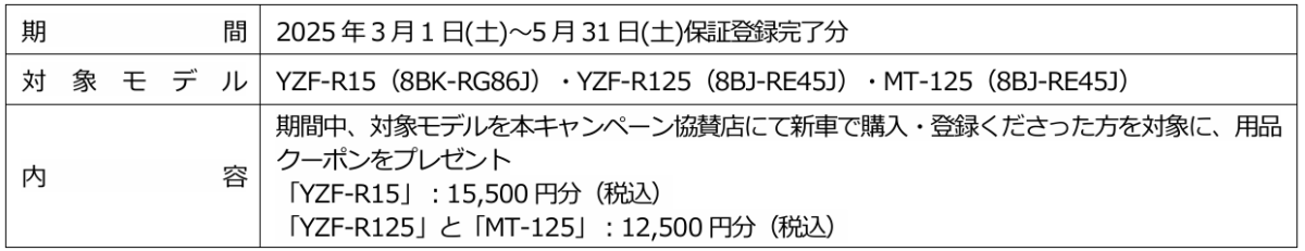 ヤマハ発動機販売株式会社は、春の新生活に向けてバイクライフデビューをサポートする「YZF-R15・R125 & MT-125用品クーポンキャンペーン」を2025年3月1日(土)~5月31日(土)に実施する。