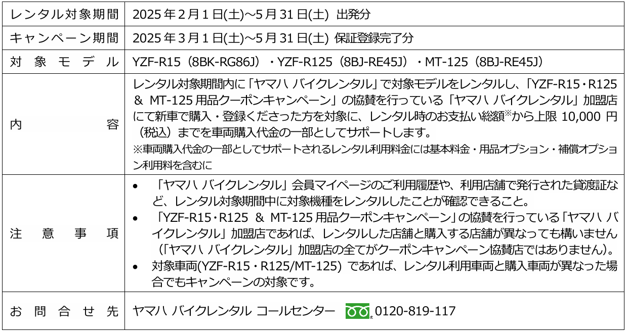 なお、「ヤマハ バイクレンタル」にて2025年2月1日(土)~5月31日(土)の期間中、「YZF-R15」「YZF-R125」「MT-125」をレンタル利用された方を対象に車両購入代金の一部として上限 10,000円(税込)までのレンタル利用料金をサポートするキャンペーンもあわせて開催します。