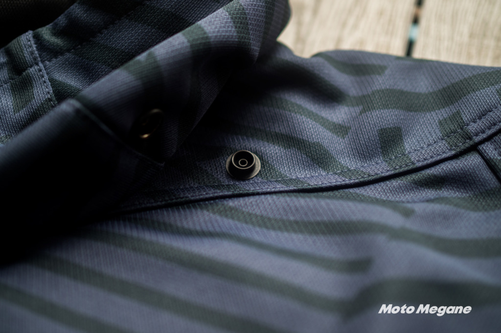 フードはバタつかないようにスナップボタンで背中に固定できるようになっています。