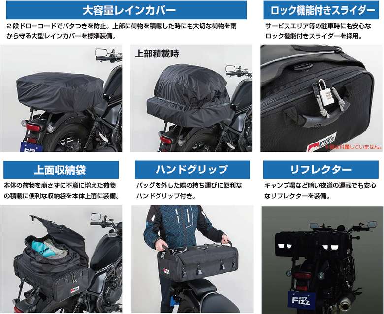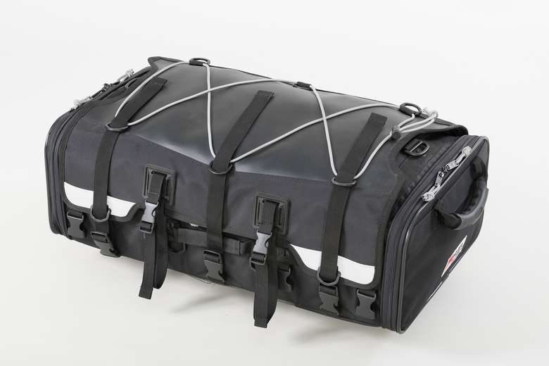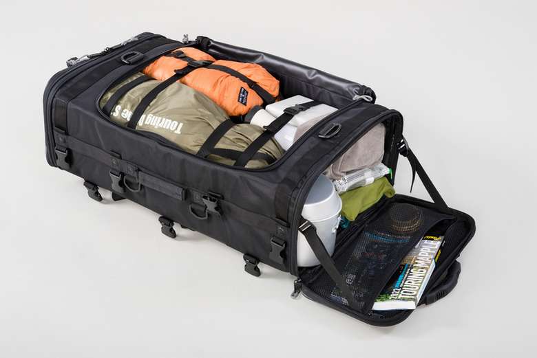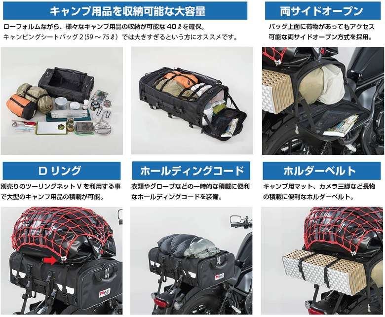 バッグ容量は40リットルだが、上部ホールディングコードや後部のホルダーベルトなど、想像以上の積載性があり、キャンプツーリングにも使用できるだろう。
