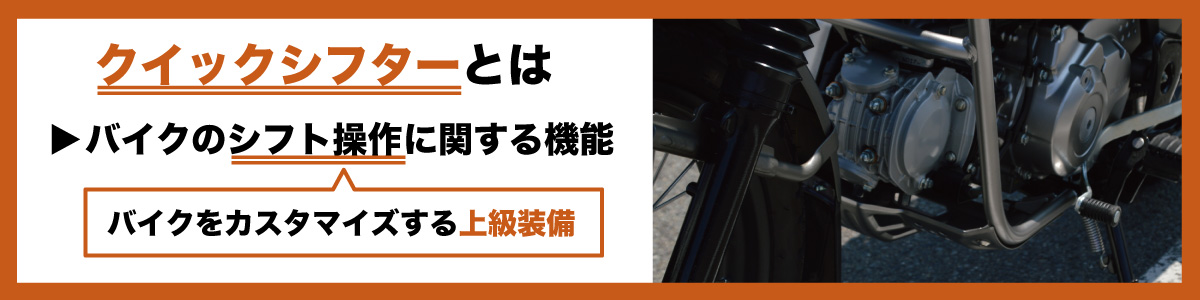 クイックシフターはバイクの装備として最近普及し始めた装備で、通常のバイクをカスタマイズする上級装備にあたります。クイックシフターはバイクのシフト操作に関する機能で、通常のバイクに追加で装備します。