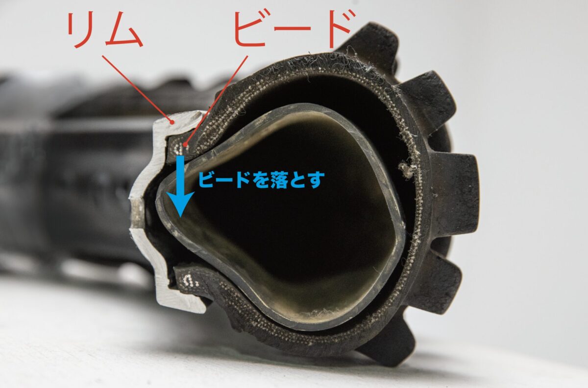 こうなるわけです。リムの高い部分に触れていたビードが、リムの深いところに落ちます。この落差があるから、タイヤが片方に偏り、タイヤを脱着できるようになるわけなんです。リムとビードが密着しているので、これを「剥がす」という表現の方が合っているかもしれませんね。とにかく、タイヤ交換のキモはこの「ビードを落とす」ことにあります。はい、ここテストに出ますよ〜。