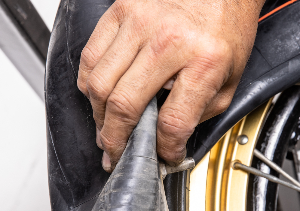 コツはチューブの持ち方です。中指でバルブを押し込めるように、タイヤの中で持つようにしましょう。