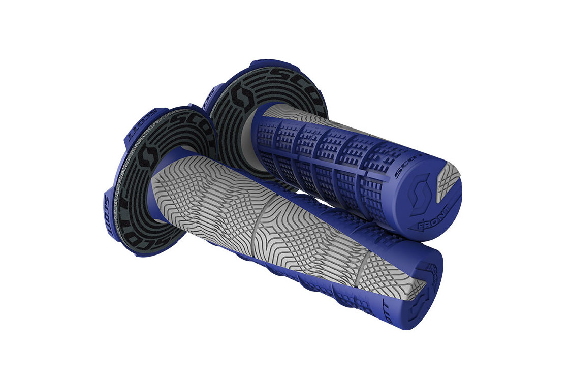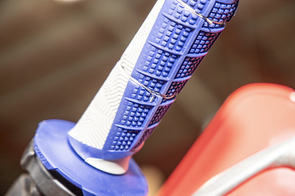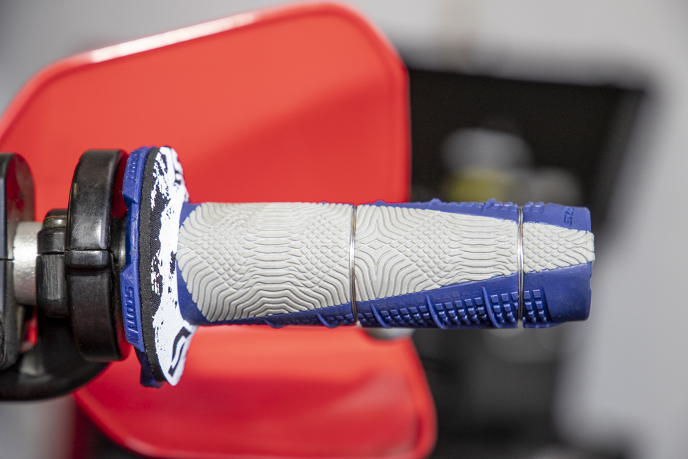 今回新しく装着するグリップはこちら。スコットのモトクロス用デュースグリップです。手のひらが当たる部分に柔らかい素材をを採用しているデュアルコンパウンドタイプで、振動による疲労を軽減してくれます。よくあるハーフワッフル形状ですがワッフルがグリップを握った時の指の形に沿って斜めに成形されている点もポイント。グリップドーナツも付属していますので、親指が擦れて痛くなってしまうのも予防できます。