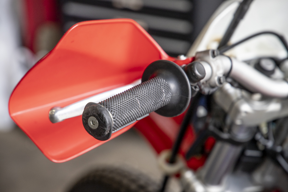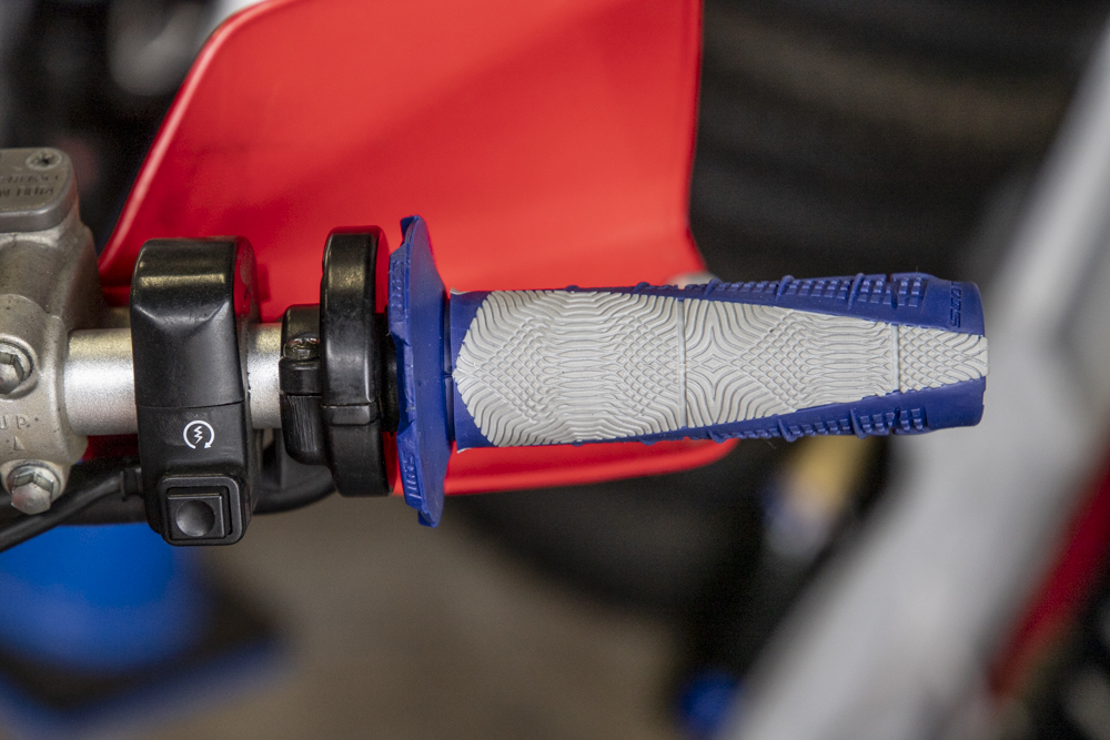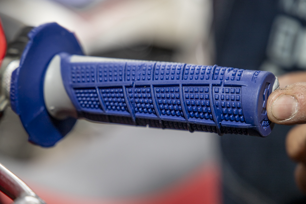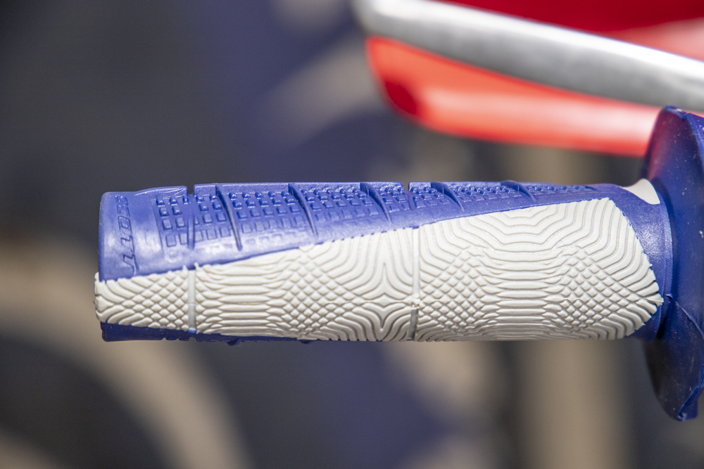 「すごく理にかなった形状をしていますね。全体的に少し太めですので、アクセルを回す力が少なくて済みます。リブやブロックがあまり深くないので、耐久性はそんなに高くないかもしれませんが、モトクロスのような短時間のレースには向いていると思います。親指側のゴムが厚くなっているから衝撃の吸収性も高そうですね。グリップはライダーの好みやグローブとの相性もあるため、一言で『このグリップが良い』とは言いづらいのです。最終的には使ってみないとわからないというのが正直なところなのですが、モトクロス用ということであれば、一つの正解の形だと思います。例えば、ツーリングだともっとゴムの硬いもので耐久性を上げたり、ラリーならグリップをもっと太くして疲れづらくしたりする。また、トライアルだと耐久性を犠牲にしてグリップを細くすることで路面の情報が伝わりやすくしているなど、使用用途ごとにある程度のセオリーはできてきていますよね」と渡辺さん。