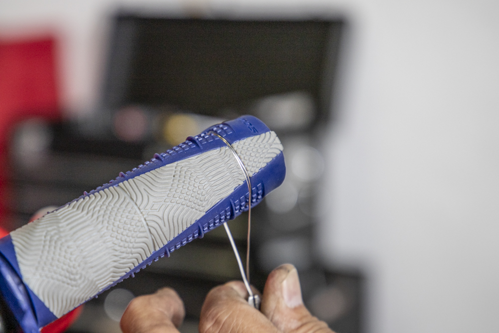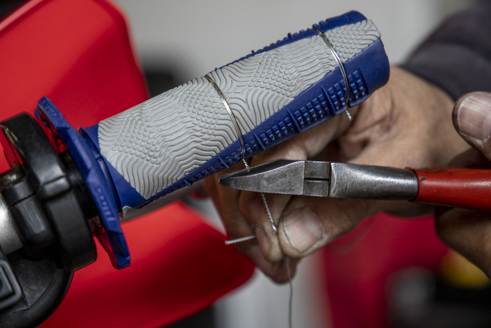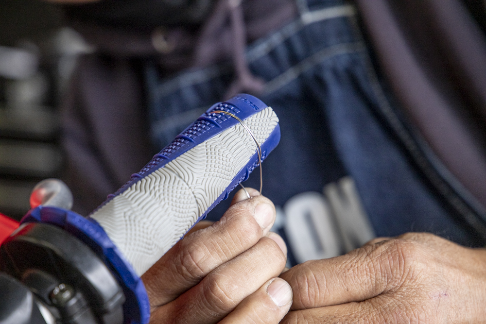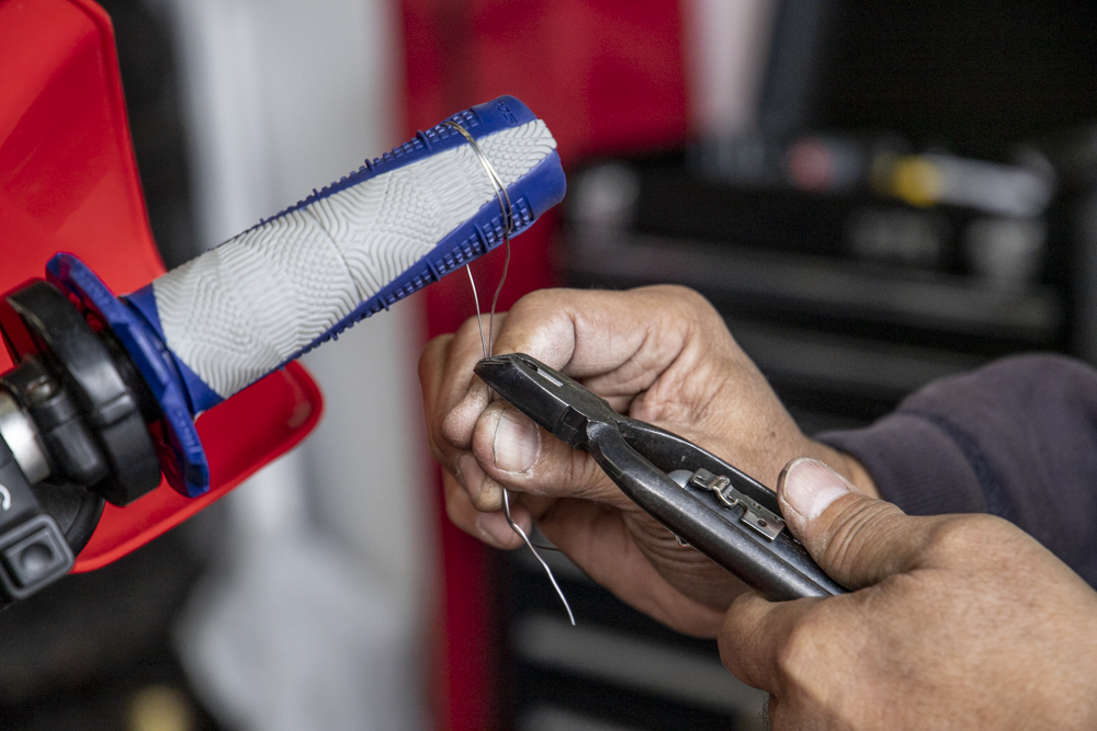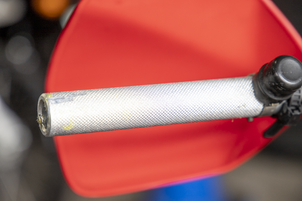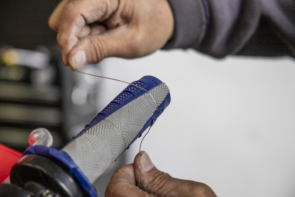 こんな感じ。押し込む方向はグリップの外側派と内側派がいるのですが、渡辺さんは内側派。理由は、と尋ねると「正直どちらでも良いのですが、僕は内側に潰しています。転倒した時にはグリップの外側から押されるので、内側に向かって力がかかります。その時にワイヤーの先端が外側を向いていたら、それが手に刺さる可能性がありますよね」とのこと。こんな細かいところまで考えて作業しているんですね。