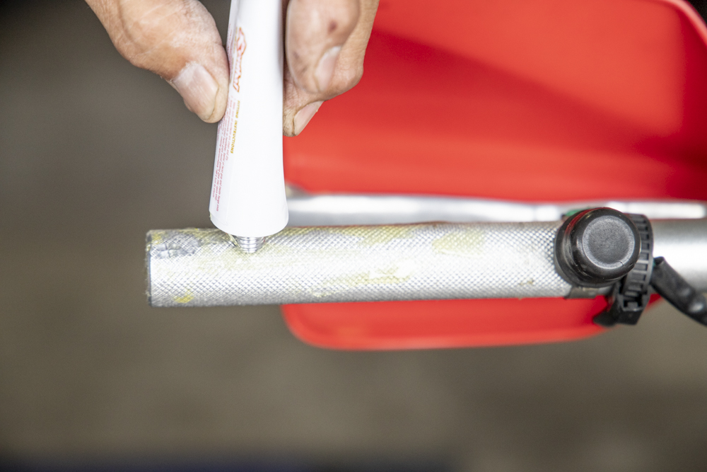 今回はこちらのグリップグルーを使いました。アルミとゴムを接着するため、グリップ専用ボンドを使用してください。グリップボンドは乾いたら接着剤として効果を発揮するのですが、グリップを挿入する際には潤滑剤として機能します。そのため惜しまずにたっぷりと塗るようにしましょう。