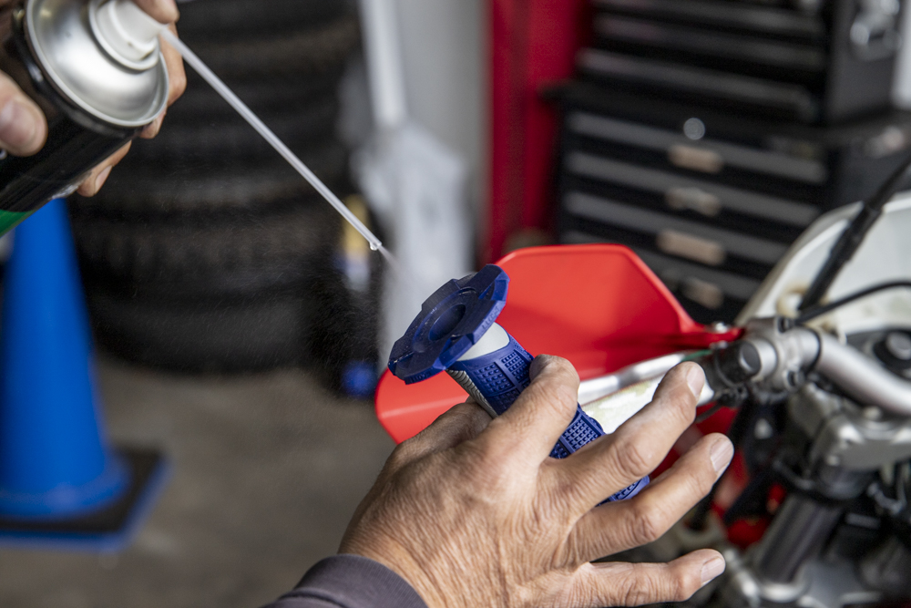 新品グリップを簡単に挿入するのに一番大事なポイントがここ。グリップを挿入する前に、穴の中にパーツクリーナーをたっぷり吹き付けてあげましょう。これをしないと潤滑が足りずにグリップが途中までしか刺さらず、それ以上入らないし、抜けないという悲惨な状況になってしまう可能性があります。パーツクリーナーは少し時間が経てばグリップ内部で揮発してくれるので、拭き取る必要もありません。