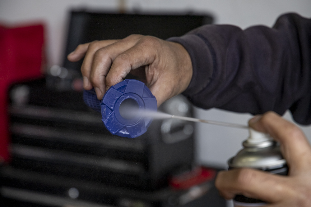 新しいグリップを挿入するときも、外す時と同じようにエアーを吹き込みながら差し込んでいけば、簡単に入れることができます。ではエアーコンプレッサーがない人はどうするかと言うと、パーツクリーナーを使います。