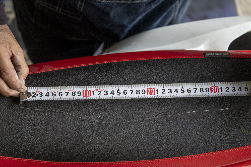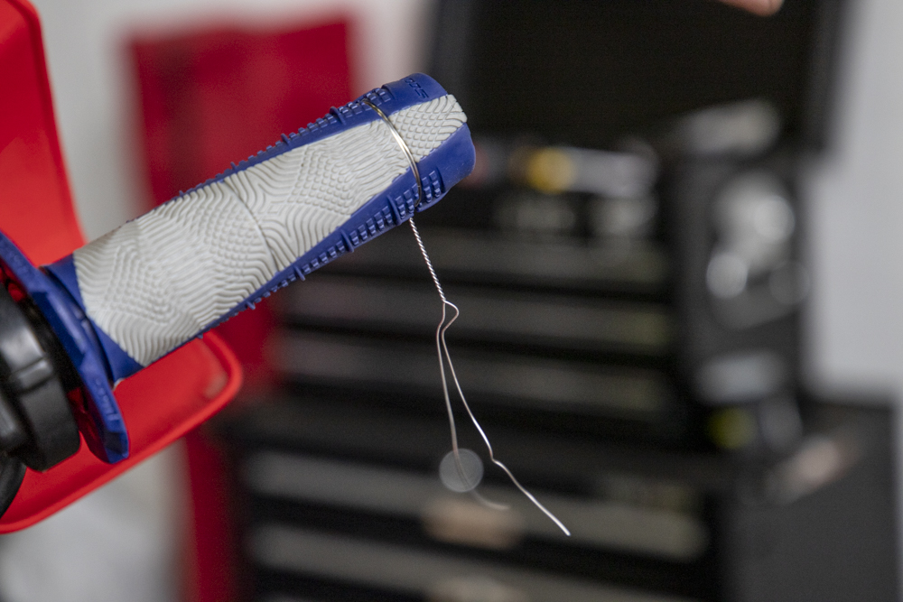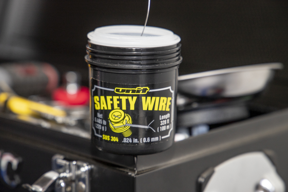 今回、ワイヤリングに使うワイヤーはこちら。UNITのセーフティワイヤーはグリップだけでなく、ドレンボルトの滑落防止など様々なワイヤリングに使えます。なお、グリップのワイヤリングに使うワイヤーはなんでも良いというわけではありません。渡辺さんは「ワイヤーの素材はステンレスで錆びないものを使いましょう。太さは0.6mmくらいがちょうど良く、これより細すぎるとグリップに食い込んでグリップが切れてしまうし、太すぎると巻きにくい。例えばワカサギを釣るのにイシダイ釣る糸は使いませんよね。それと同じです」と、趣味の釣りに例えてくれました。