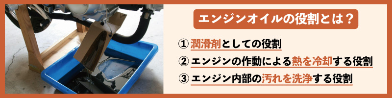 1つは潤滑剤としての役割です。エンジン内部で高速で動く部品の間に薄い膜を作り、摩擦を減らしてスムーズに動くようにします。その他にも、エンジンが作動することによって発生する熱を冷却する役割や、エンジン内部の汚れを洗浄する役割などがあります。