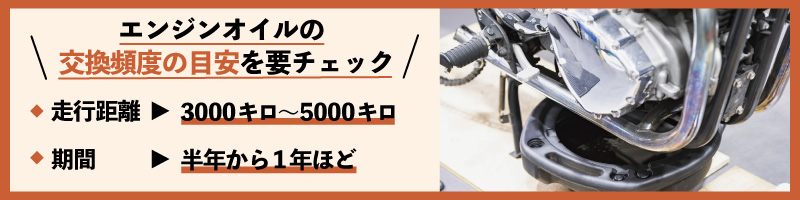 エンジンオイルの交換頻度はメーカーの取り扱い説明書で確認しましょう。一般的には、走行距離を目安にするならば3000キロ〜5000キロ、期間を目安にするならば半年から1年ほどとされています。しかし、排気量やエンジンの構造によってバイクごとに変わってくるので、取扱説明書を確認するのが理想です。