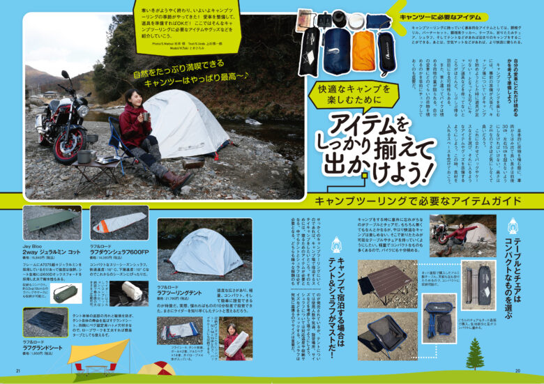 フリーペーパーでは様々な巻頭特集、キャンプ関連の特集に加え、最新の注目商品を紹介。バイク好き、キャンプ好き必見の内容となっています。