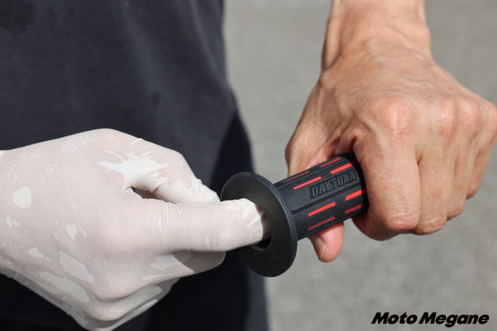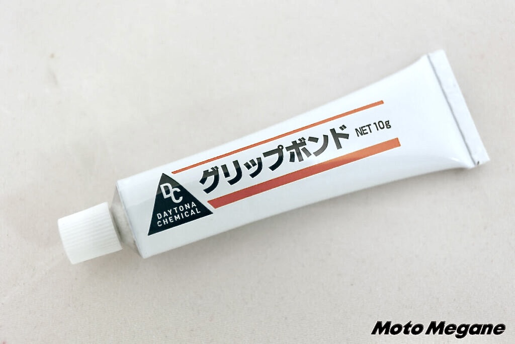 新しいグリップを取り付ける時は、しっかりと接着剤を塗りつけること。グリップは樹脂製品だから、有機溶剤を含む接着剤とは相性がある。ものによっては、接着剤の成分がグリップを溶かしてしまうこともある。そこでオススメなのがDAYTONAのグリップボンド。