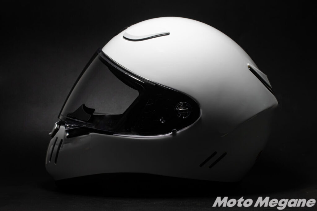 ノーズ部には開閉機構を備えた現代的なベンチレーションを供えています。アゴの部分に設けられた左右2箇所のメッシュスリットはデザイン上のアクセントとして設けられたもので、実際に走行風は侵入してきません。ヘルメットの静粛性を求めた結果の設計ですが、ブレードランナーの個性を演出する重要なパーツです。