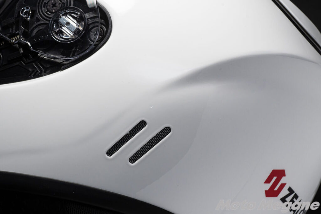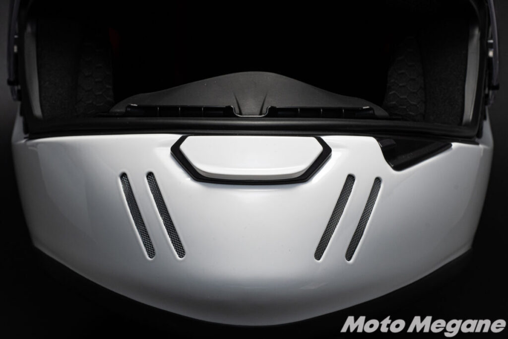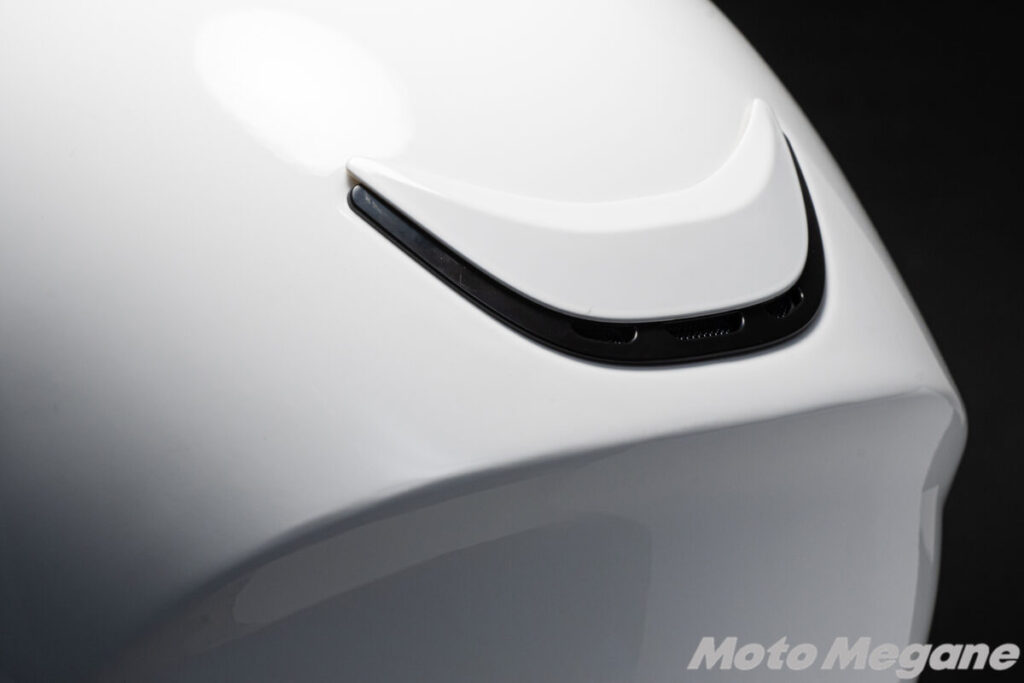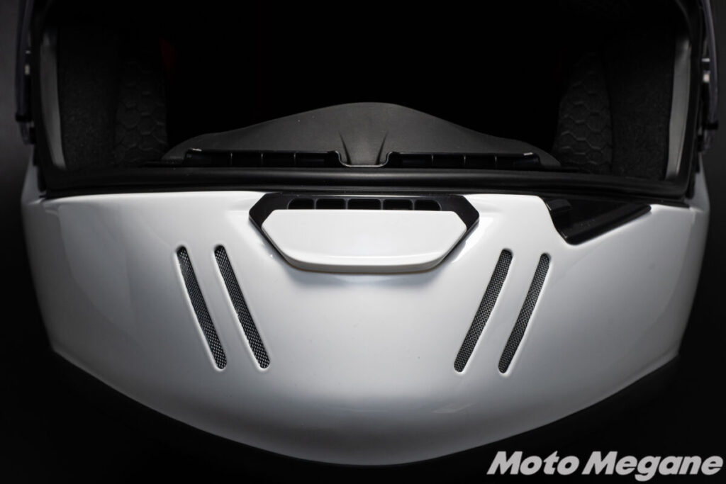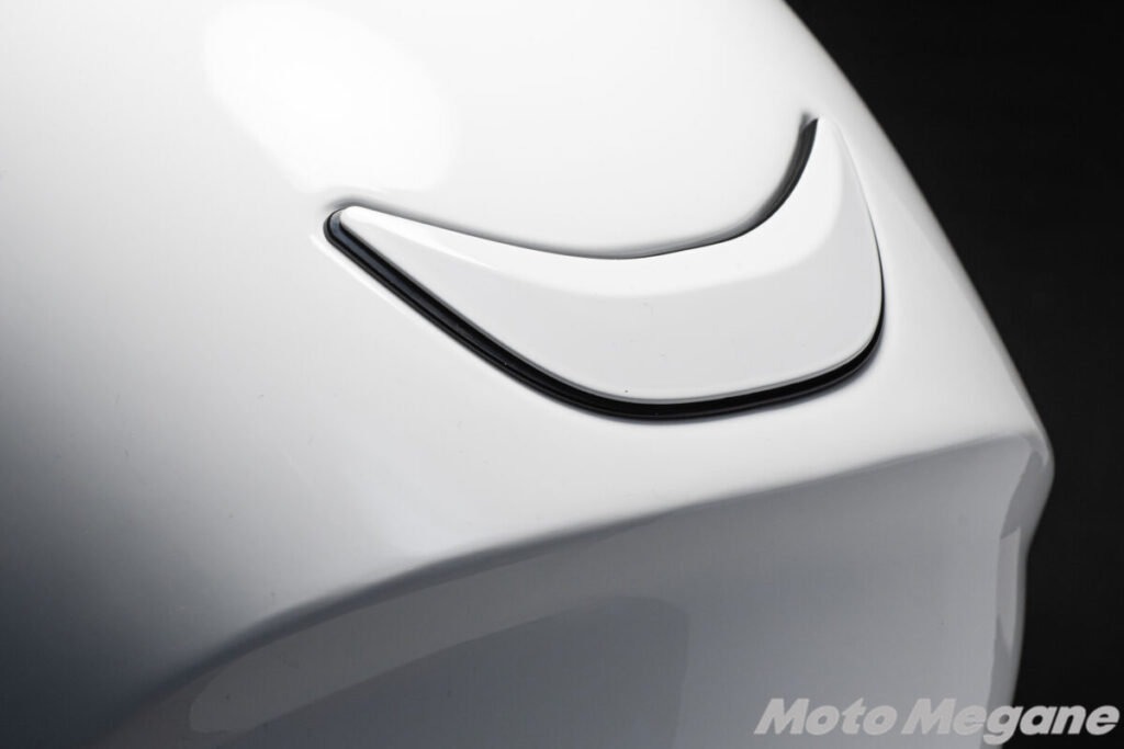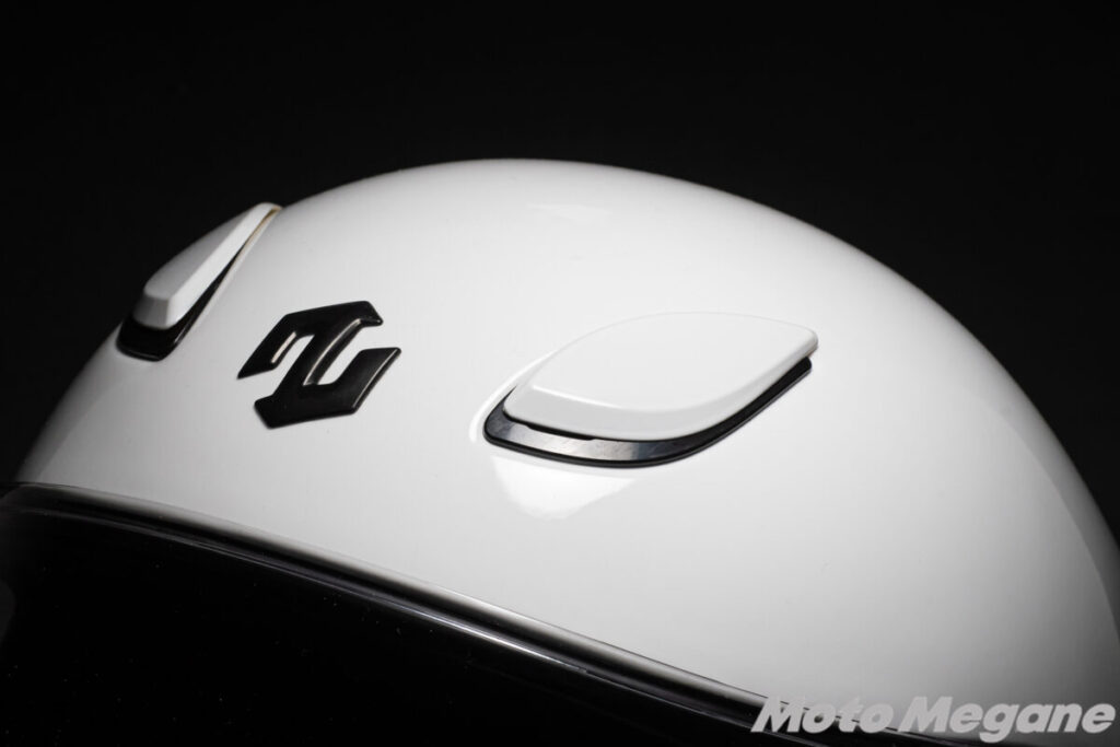 また前頭部、つまりおでこにあたる部分には、左右2箇所の開閉式ベンチレーションを装備。この開閉式ベンチレーションは開閉操作の際には確かなクリック感もあり、グローブをしたままでも確実な開閉が可能です。