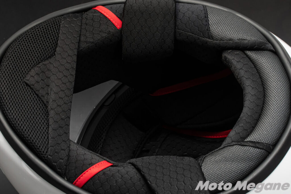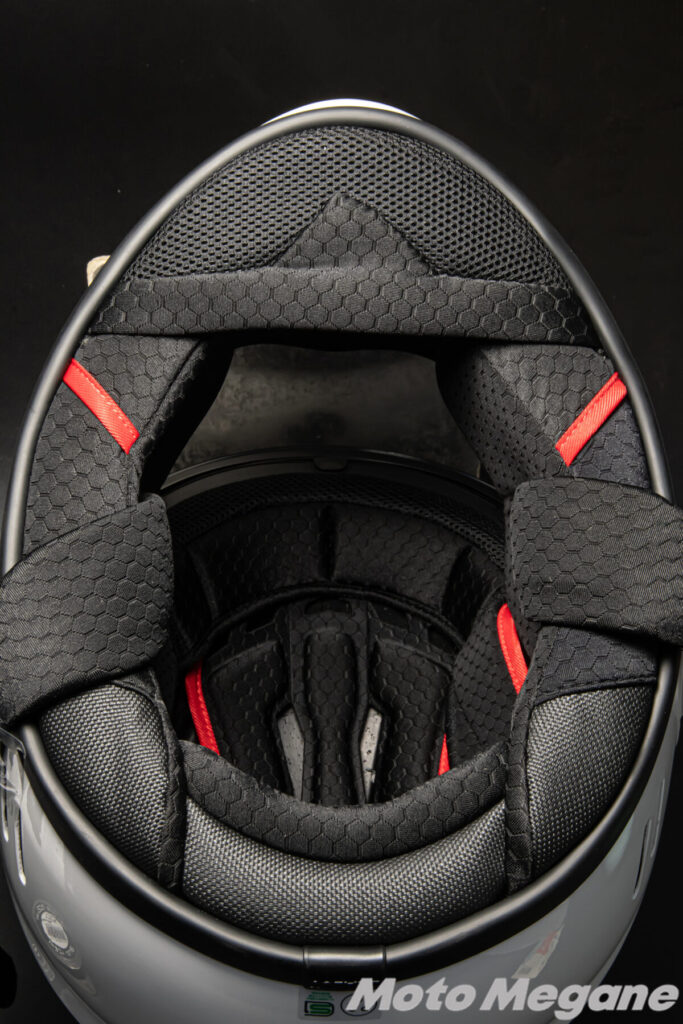 また、ヘルメット底部には走行風の巻き込みを防ぐ大型のチンスポイラーも装備。高速道路を延々と走る時や真冬の走行時には大きな効果を発揮します。また、ヘルメット下部の開口部を少なくすることで走行音の侵入もある程度防ぐことができるので、ヘルメット内部の静粛性向上にも大きな効果を持っています。インカムでの通話や音楽を楽しみながら走る場合には頼もしいパーツのひとつと言えます。