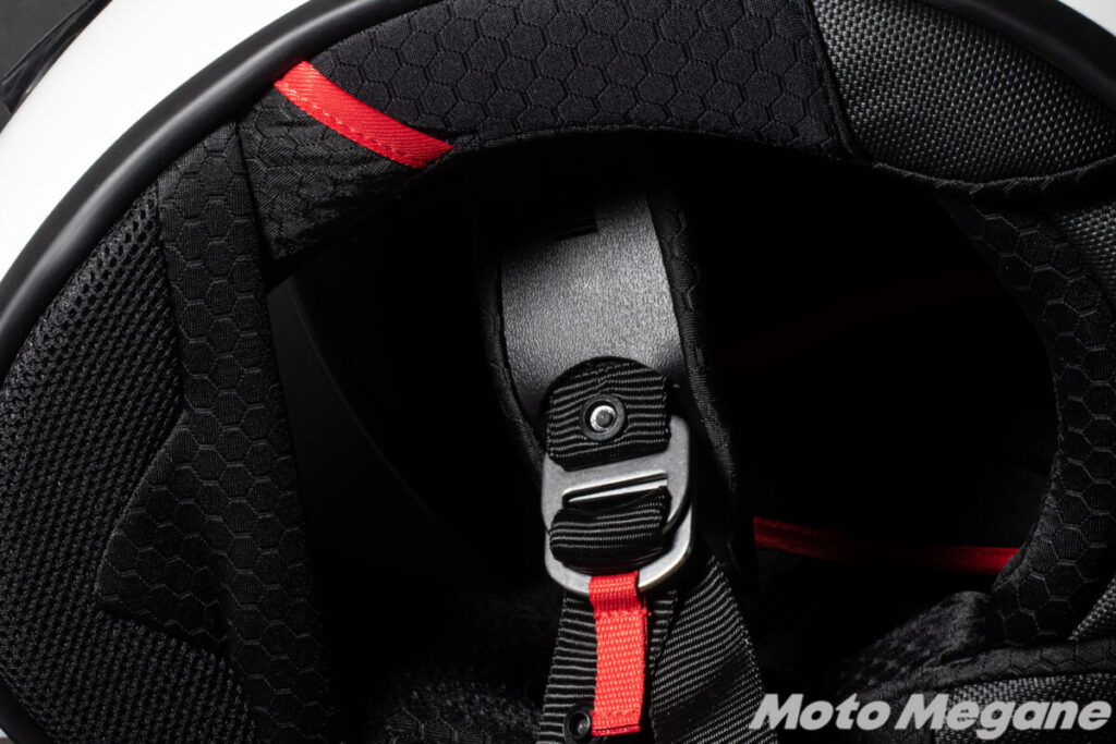 ブレードランナーのアゴ紐には一般的なDリングを採用しています。リングを通した後のベルトは折り返してスナップボタンで留めるスタイルで、ベルトの緩み止め、そしてバタつきも防いでくれます。また、ナイロン素材のベルト両端は肌あたりも滑らかなので、長時間ヘルメットをかぶっていても肌に負担をかけづらい印象です。