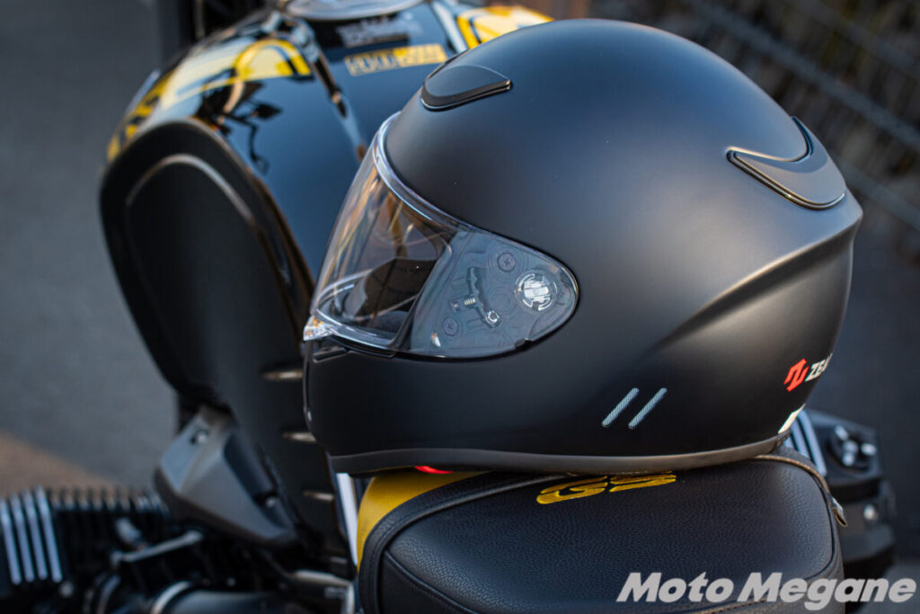 じつは、このブレードランナーは、絶版旧車メインのレース「テイスト・オブ・ツクバ」をイメージして開発、デザインされたヘルメットです。「テイスト・オブ・ツクバ」は現行車顔負けのスピードで国内のトップライダー&トップビルダーが競う世界でも指折りの旧車レース。脅威的な速さで筑波サーキットを駆けぬける70年代や80年代の車両に、性能的にもデザイン的にもフィットするヘルメットを生み出したい……。ブレードランナーにはそうした開発経緯があります。そんなこともあって、このブレードランナーはMFJ公認ヘルメットの規格を有しています。つまり国内のMFJ公認レースでも使える安全性に優れたヘルメットなのです。