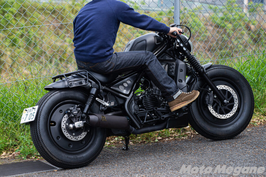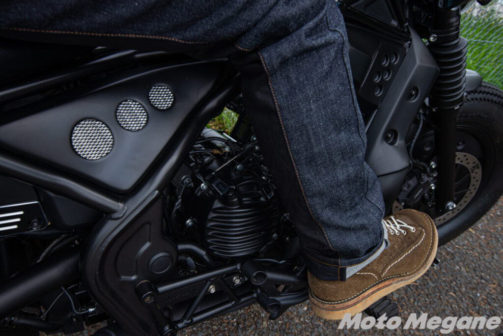 今回スペースモンキーコンボパンツをテストするに当たって用意したのはホンダ・レブル250です。しかもただのレブル250ではなく、K-Speed製のコンプリートモデル! K-Speed製のフルキットを装着したレブルは、ステップが純正位置よりも15cm以上も前方に配置されたフォワードコントロール仕様。つまり膝から足首はエンジンの真横にくるライディングポジションです。