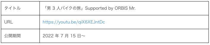 2022年7月15日16:00~WEB動画『「男3人バイクの旅」Supported by ORBIS Mr.』配信開始。